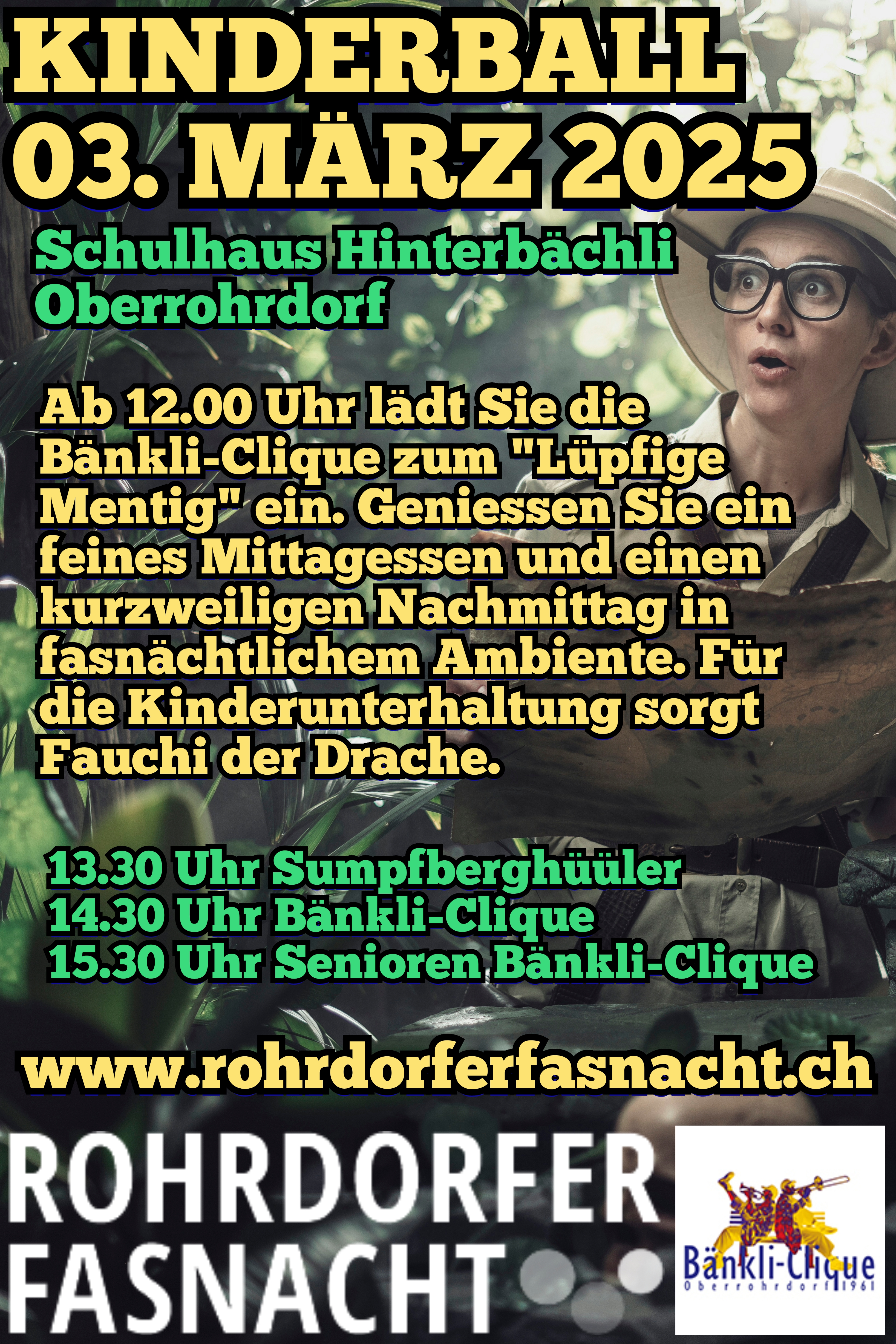 Ab 12:00 Uhr lädt Sie die Bänkli-Clique zum "Lüpfige Mentig" ein. Geniessen Sie ein feines Mittagessen und einen kurzweiligen Nachmittag in fasnächtlichem Ambiente. Für die Kinderunterhaltung sorgt Fauchi der Drache.